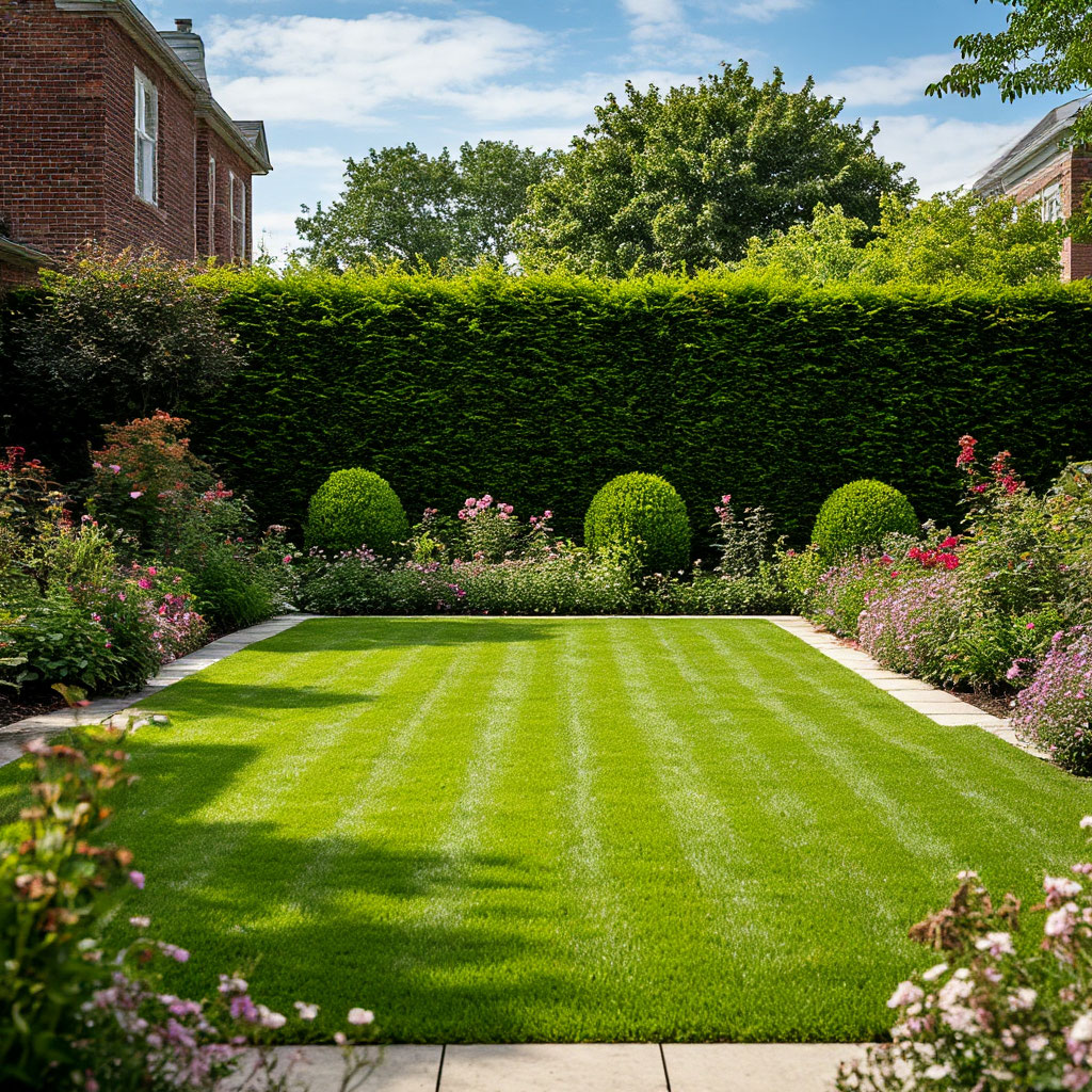 Классика английского стиля — стриженые полосы разной длины, идущие параллельно или в шахматном порядке. Этот приём работает даже на скромной по площади лужайке: визуально он увеличивает участок и придаёт ощущение порядка. Техника проста: после каждой стрижки меняйте направление движения косилки. Для лучшего эффекта полосы делают шириной 1–1.5 м. Такой дизайн особенно уместен на газоне у дома, где важна «парадность» вида. Для реализации подойдёт любая газонная смесь, но предпочтительны медленнорастущие виды — они дольше сохраняют чёткость рисунка.